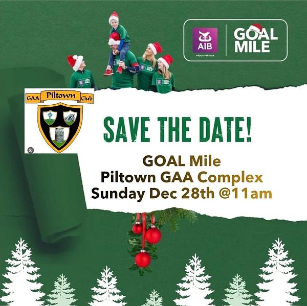 Reminder to come join Piltown GAA Club on Sunday December 28th at 11am to walk, jog, or run a mile for the GOAL MILE!