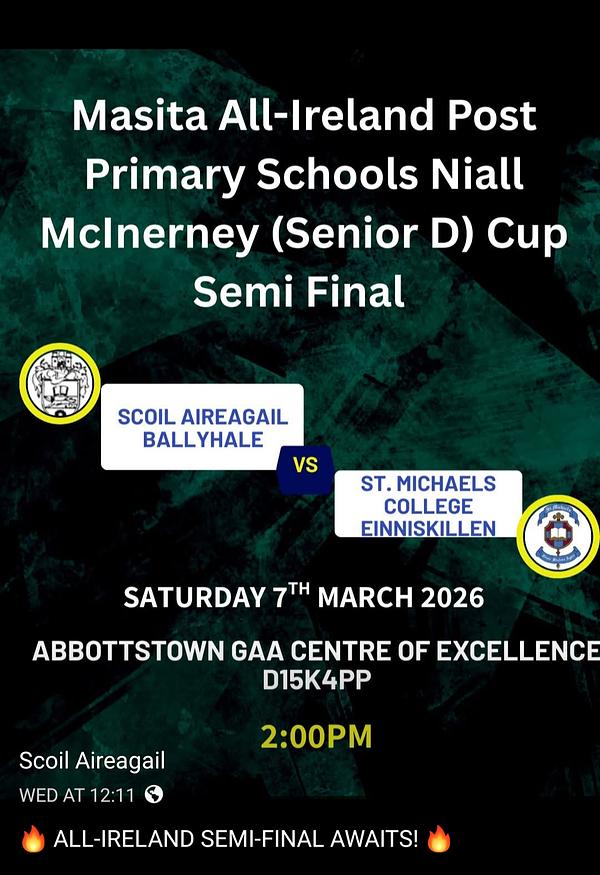 Best wishes to Oisin Reid and his Scoil Airegail teammates as they line out in the Schools All Ireland semi final this Saturday.